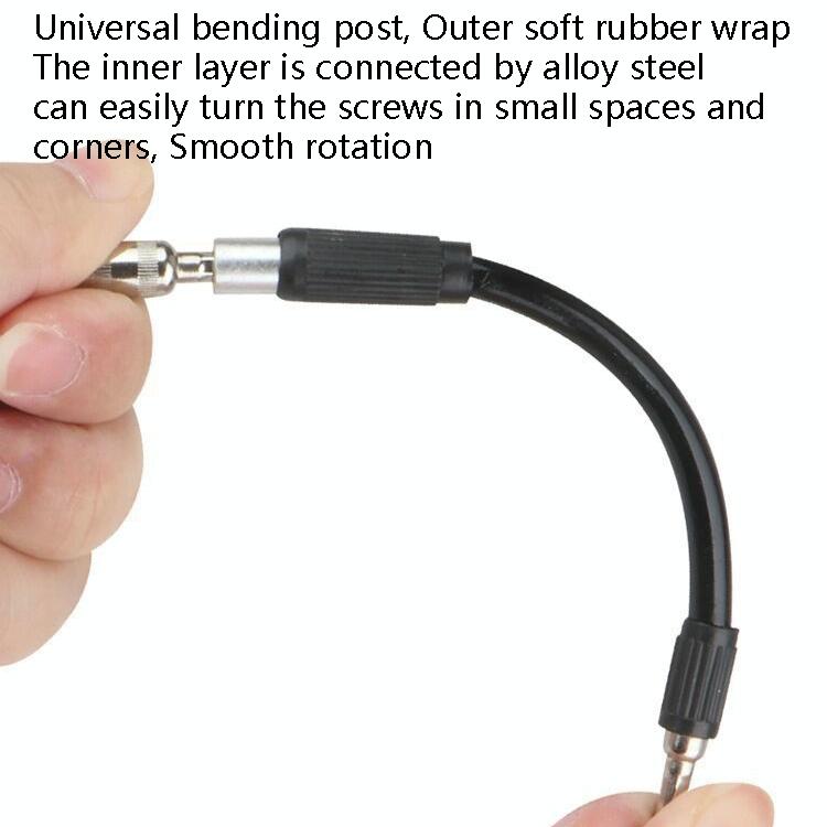 1. Universal bending post, the outer layer is wrapped by soft rubber, the inner layer is connected by alloy steel, you can easily turn the screws in the narrow space and corners, and the rotation is smooth
