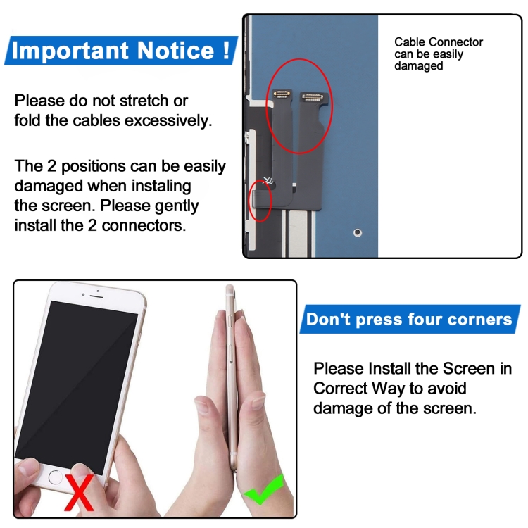 Screen replacement is very fragile product. We strongly suggest test before installation. Please simulates testing, which means mobile phone apart, (motherboard + LCD or screen) connected audio cable and new replacement, power on, test finished. If test OK, please install it. If it can not show, please contact us at the very first time. And please do not force it to be installed in mobile phone. We will not be responsible once the screen is installed.