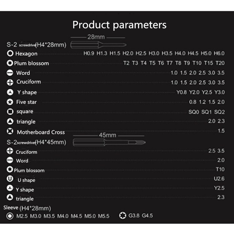 – Sockets: M2.5 M3.0 M3.5 M4.0 M4.5 M5.0 M5.5 G3.8 G4.5