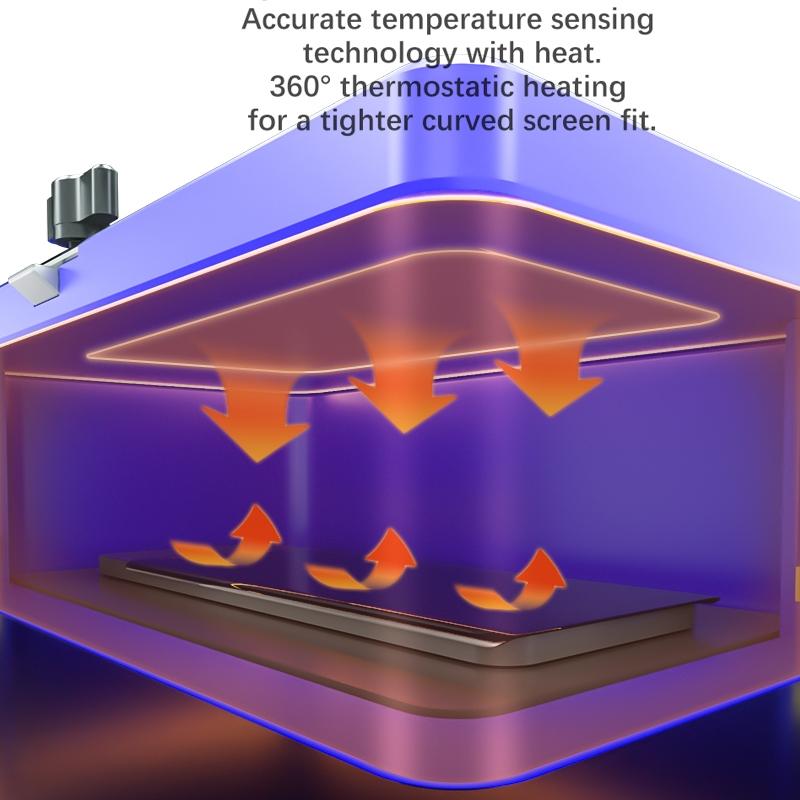3. Dual heat source, balanced heating, accurate temperature sensing technology, uniform heating, 360 constant temperature heating so that the curved screen laminates more tightly.