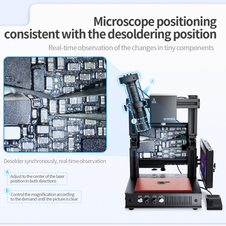 6. Adjust the laser lens to control the heating range to suit the size of the desoldering components
