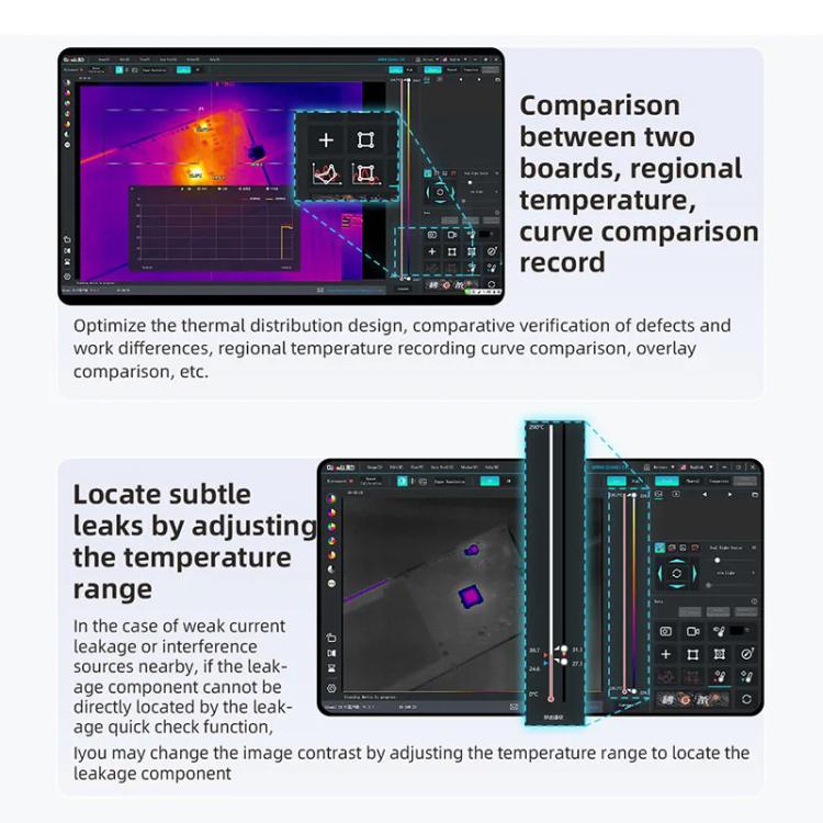 12. In the case of a weak current leakage or interference sources nearby, if the leakage component cannot be directly located by the leakage quick check function, you may change the image contrast by adjusting the temperature range to locate the leakage component