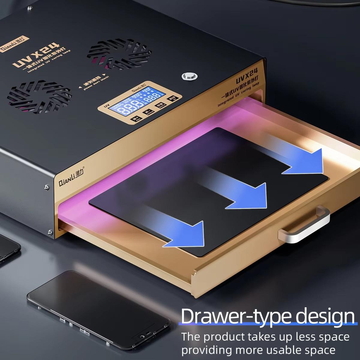 1. UVX24 integrated UV curing lamp box, powerful light source, fast curing, 50 dual-wavelength LED chips to improve efficiency, 16-inch big curing room two cooling fans